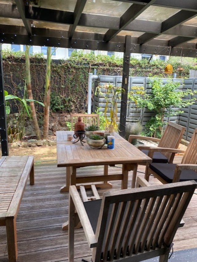家のガーデンは、バリ調の素敵なガーデンテラスがあり、お部屋にはシングルベッドがはいっており、フラットさん専用のトイレ、シャワーがあります。