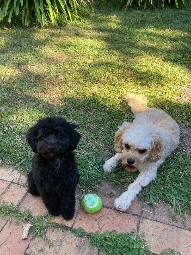 小さな犬が2匹います。 (キャバリアとトイプードル)