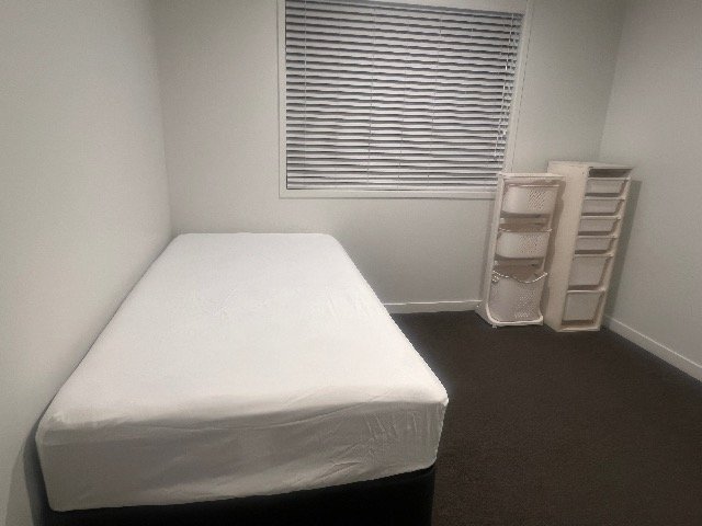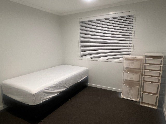 新品のベッド、洗濯機、冷蔵庫が使用可能で、