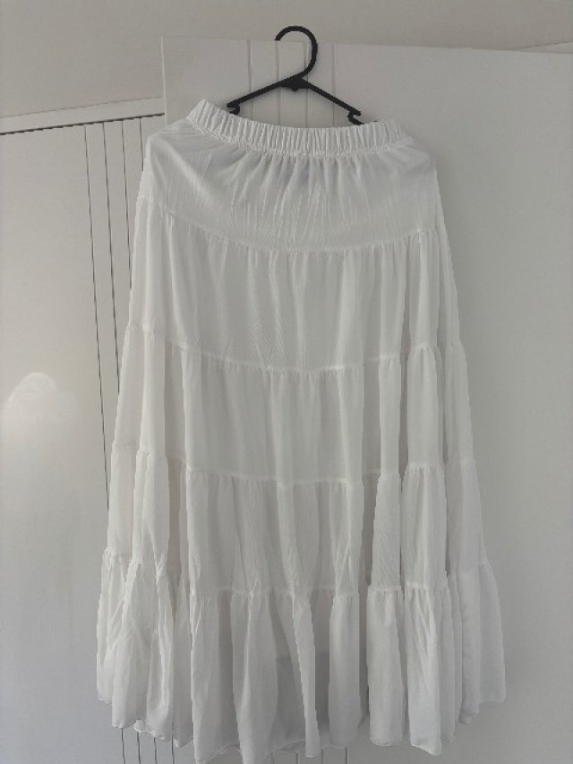 クリスマスパーティーのドレスコードに合わせて購入したMirrouの白フレアスカートSです。$10