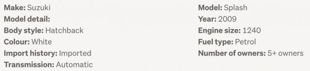 詳細 ・SUZUKI Splash ・走行距離:約195,000km ・トランスミッション:オートマ ・WOF(車検):2026年6月まで有効 ・Rego(登録):2026年6月まで有効 ・エリア:タウランガ ・受け渡し可能日:2026年1月10日〜13日 ・価格:NZ$2,950 ・車載用Bluetooth充電器付き($50相当) エンジン、エアコン、スピーカー状態良好。目立った傷もありません。