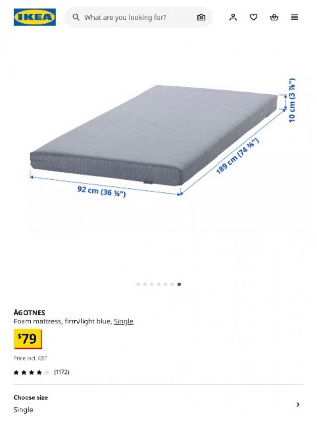 商品名はAGOTNESで、IKEA のオンラインサイトにもあるようにサイズは92*189*10cm、シングルベッドサイズです。新品で$79で購入しました。