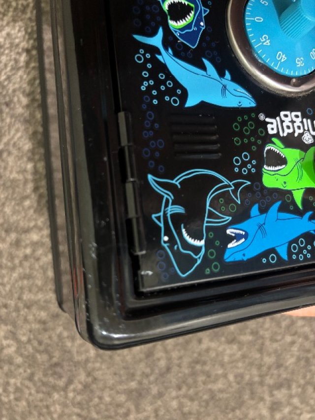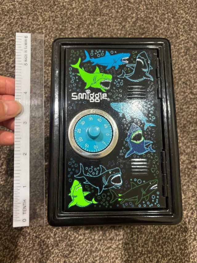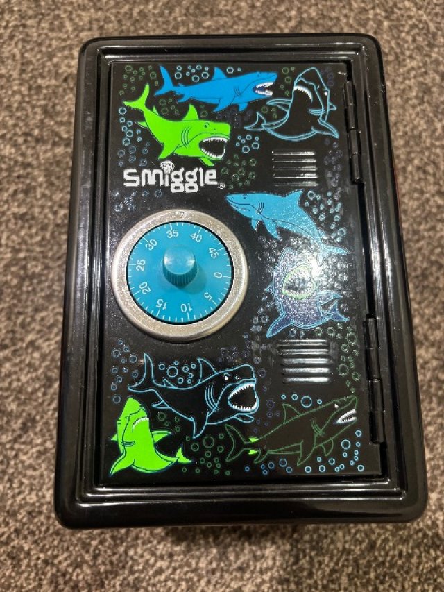Smiggleのサメの絵柄の金庫・宝箱です。本当に閉まります。裏面にある24→36の順で回していただくと開きます! ※used商品になりますので神経質な方はご遠慮ください。パッと見た目ではきれいに見えても多少の汚れなどはありますので写真でよくご確認ください。 お取引は現金でお願いいたします!場所はCBDを希望します!